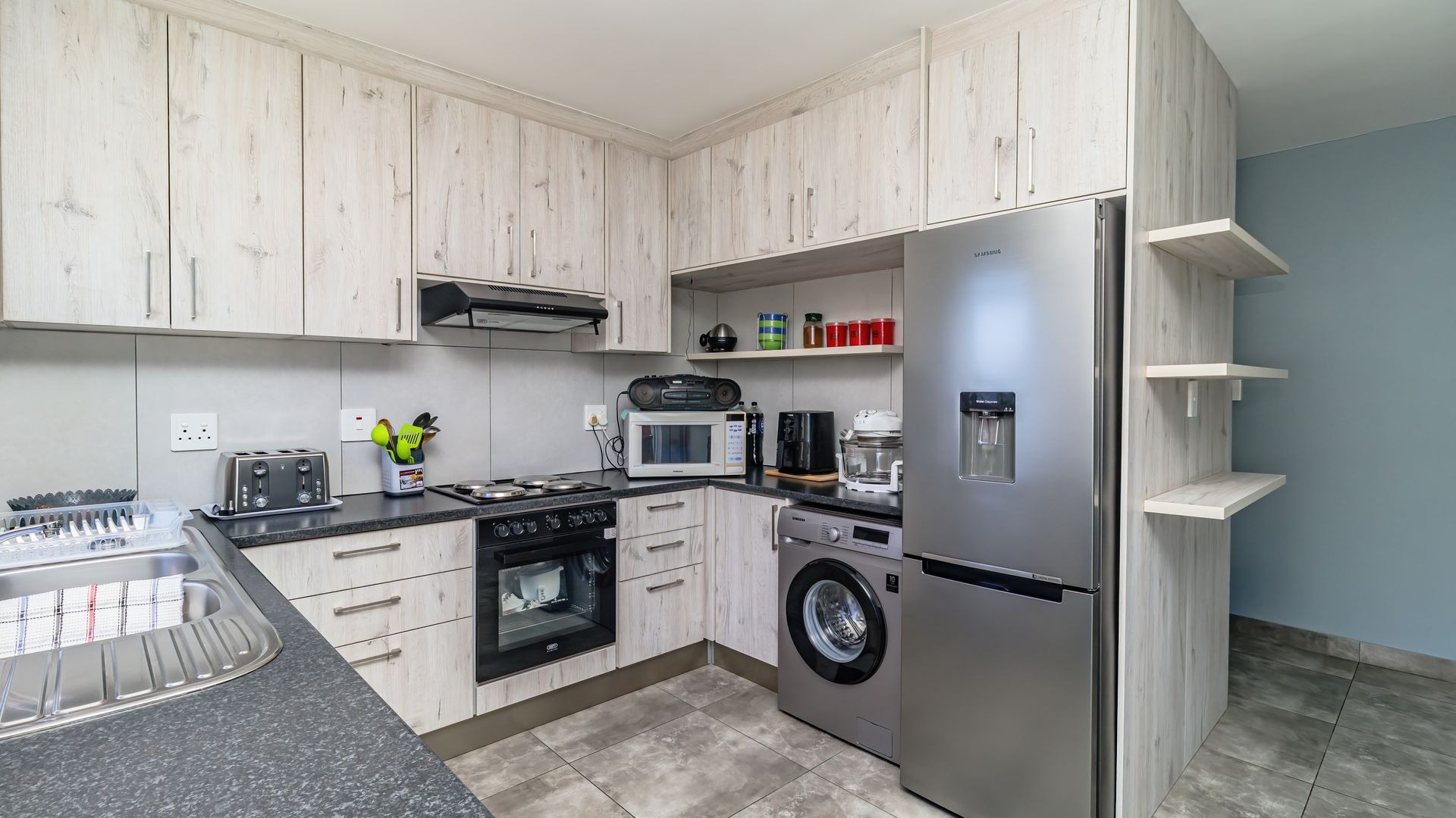 The heart of this home is its open-plan lounge, seamlessly connecting to a meticulously fitted kitchen. This culinary space boasts ample cupboard storage, a practical double sink, and features brand new, unused appliances including a stove, HOB, and extractor. For added convenience, a washing machine and fridge are thoughtfully included, making this apartment move-in ready. A private balcony extends the living space.