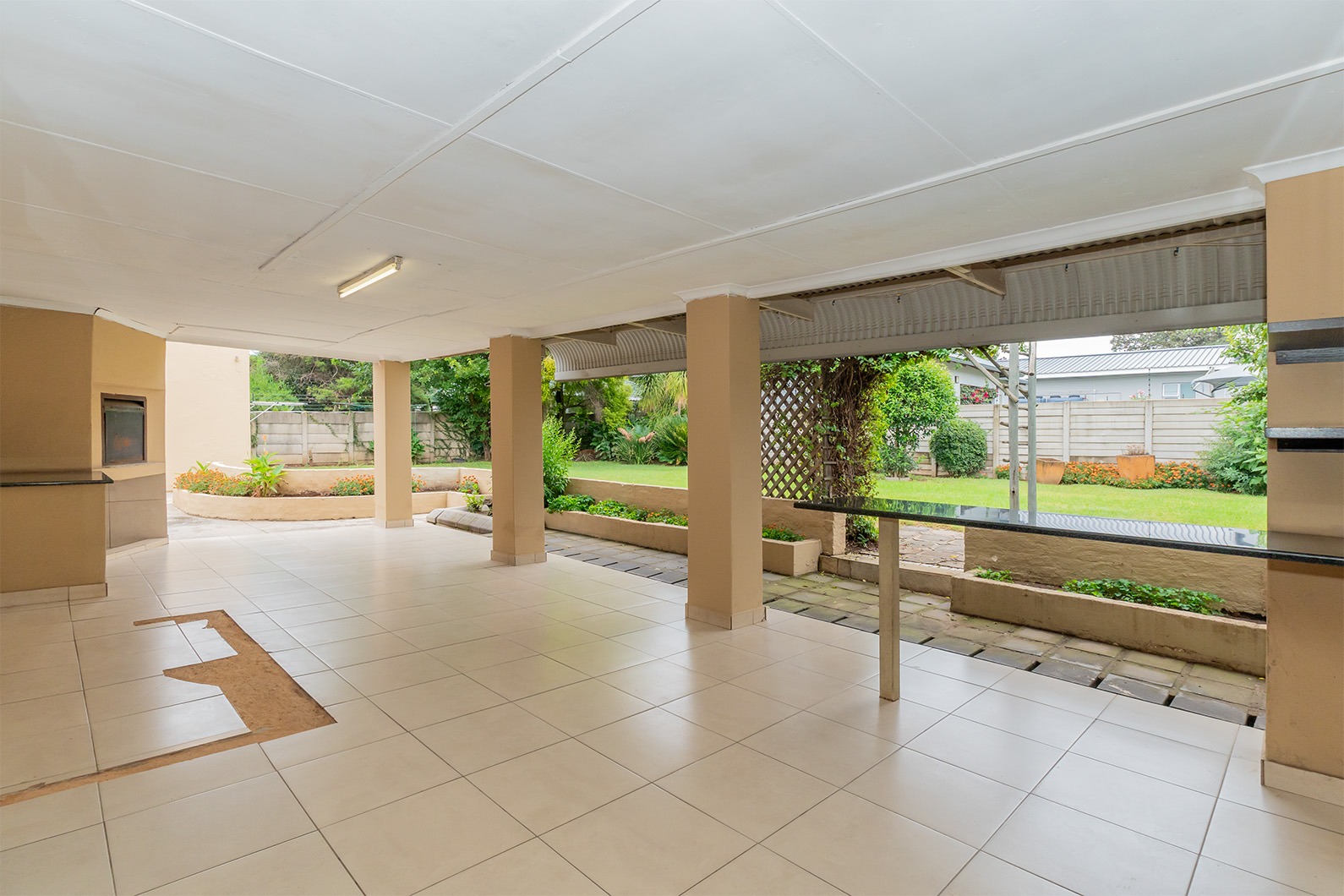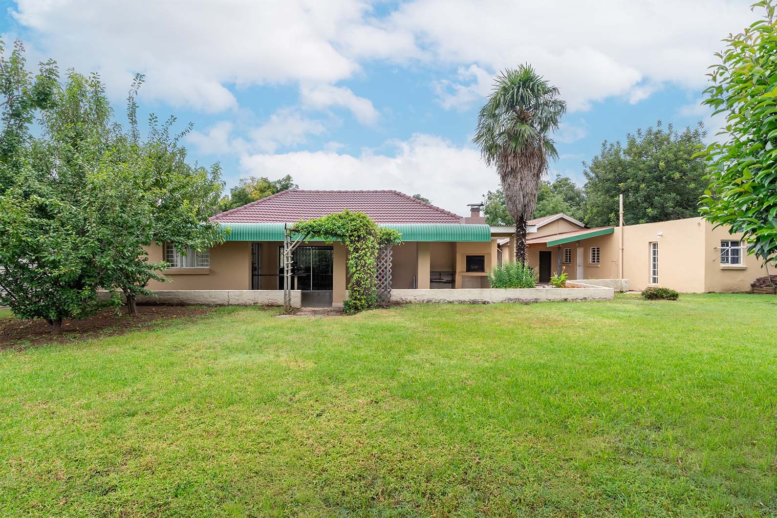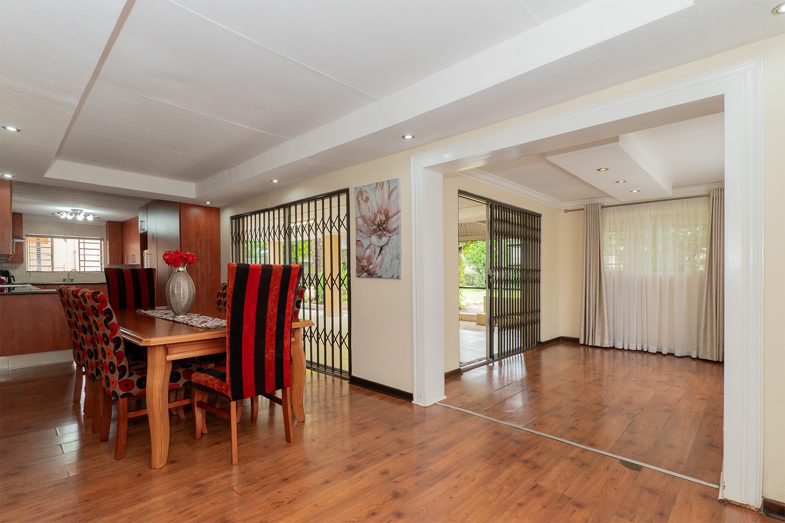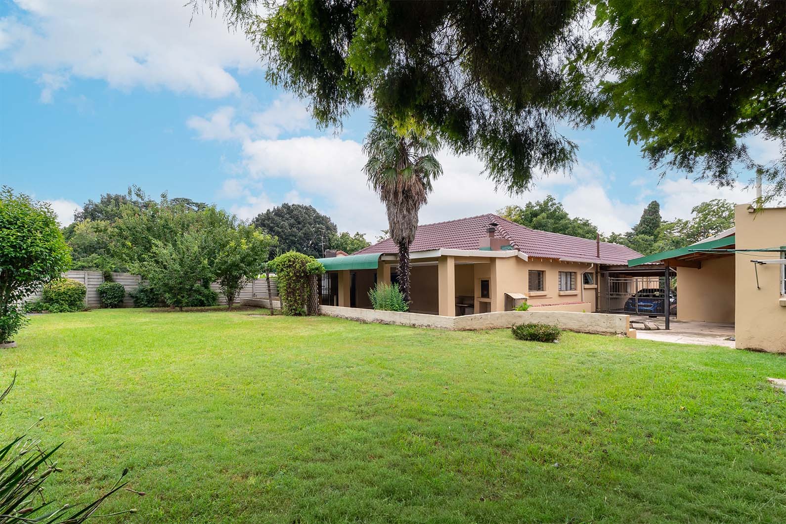 At the heart of the home is the open-plan kitchen and dining area, seamlessly flowing through double sliding doors onto an enclosed patio. This inviting space includes an undercover braai and enjoys tranquil views over the pristine, manicured garden, complete with a variety of established fruit trees.