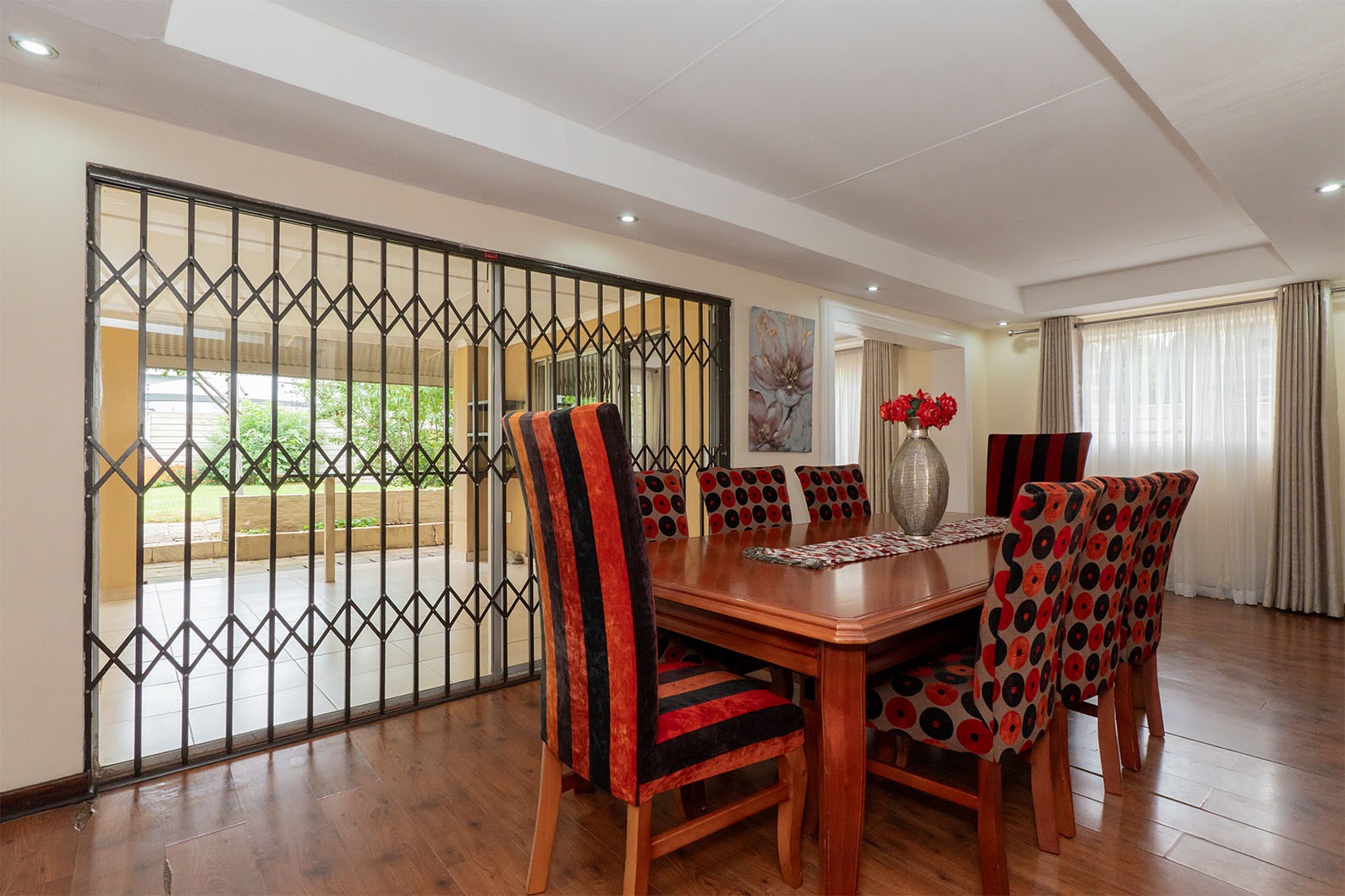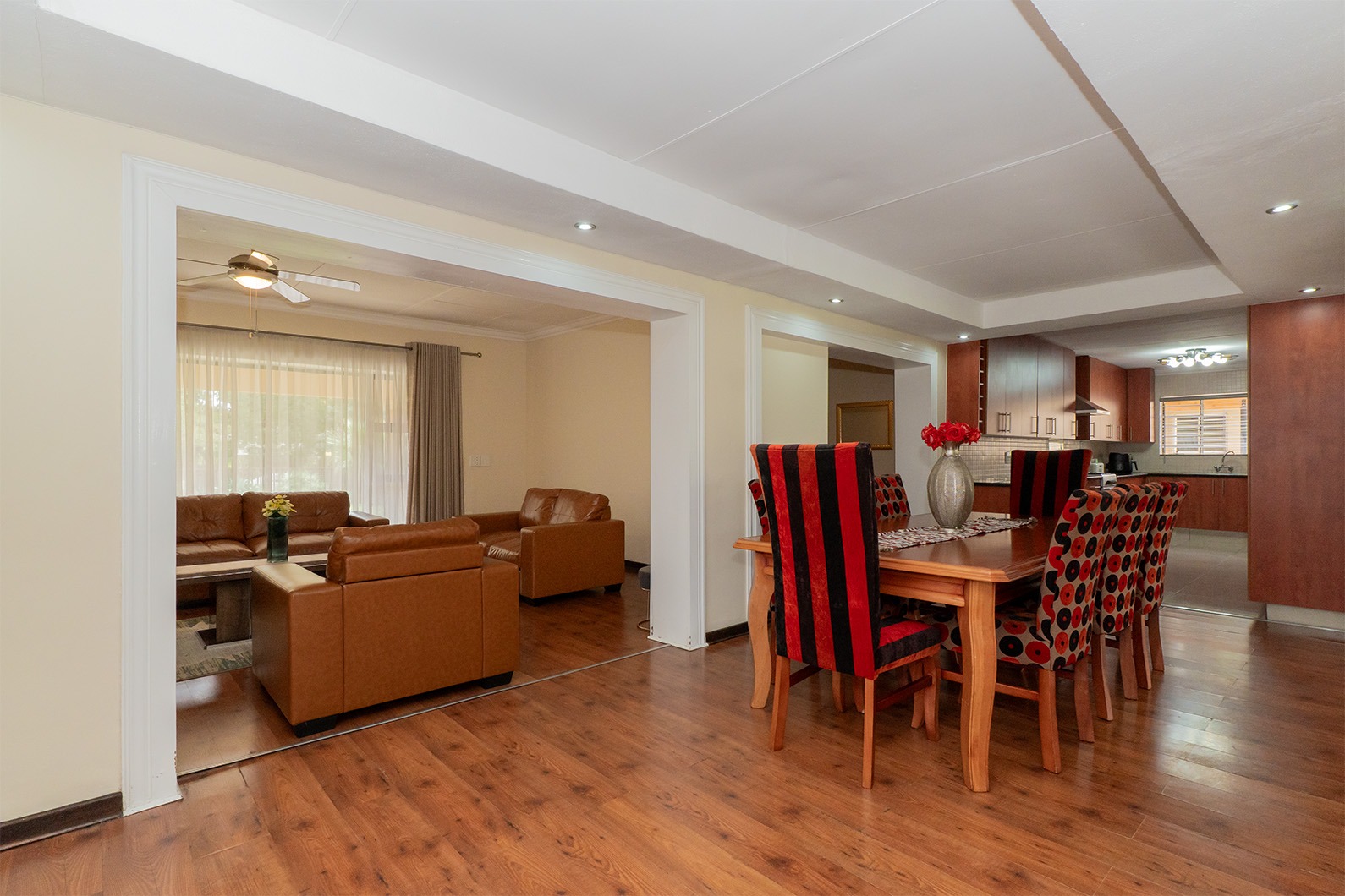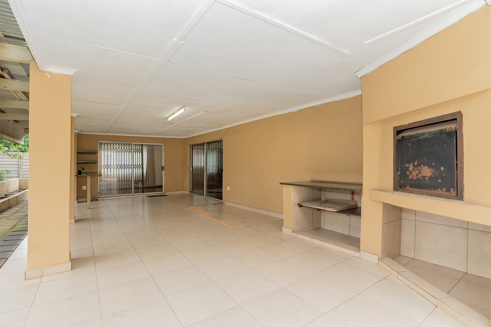 At the heart of the home is the open-plan kitchen and dining area, seamlessly flowing through double sliding doors onto an enclosed patio. This inviting space includes an undercover braai and enjoys tranquil views over the pristine, manicured garden, complete with a variety of established fruit trees.