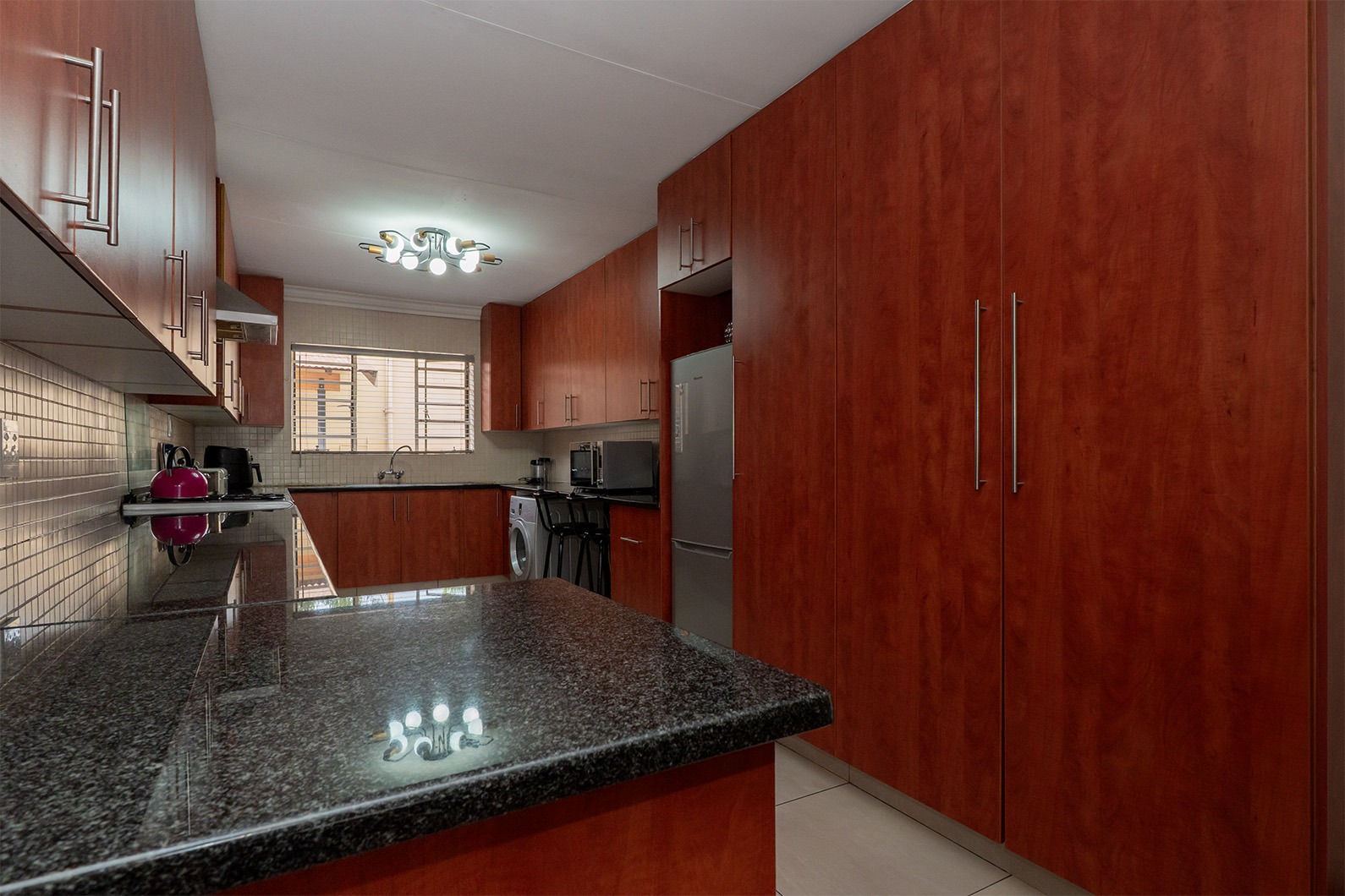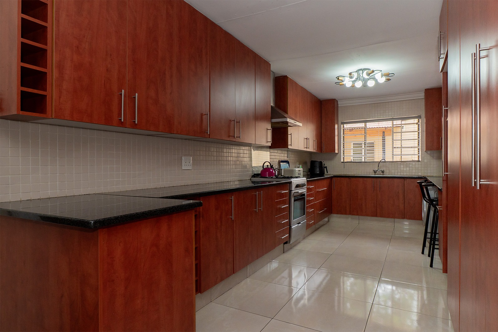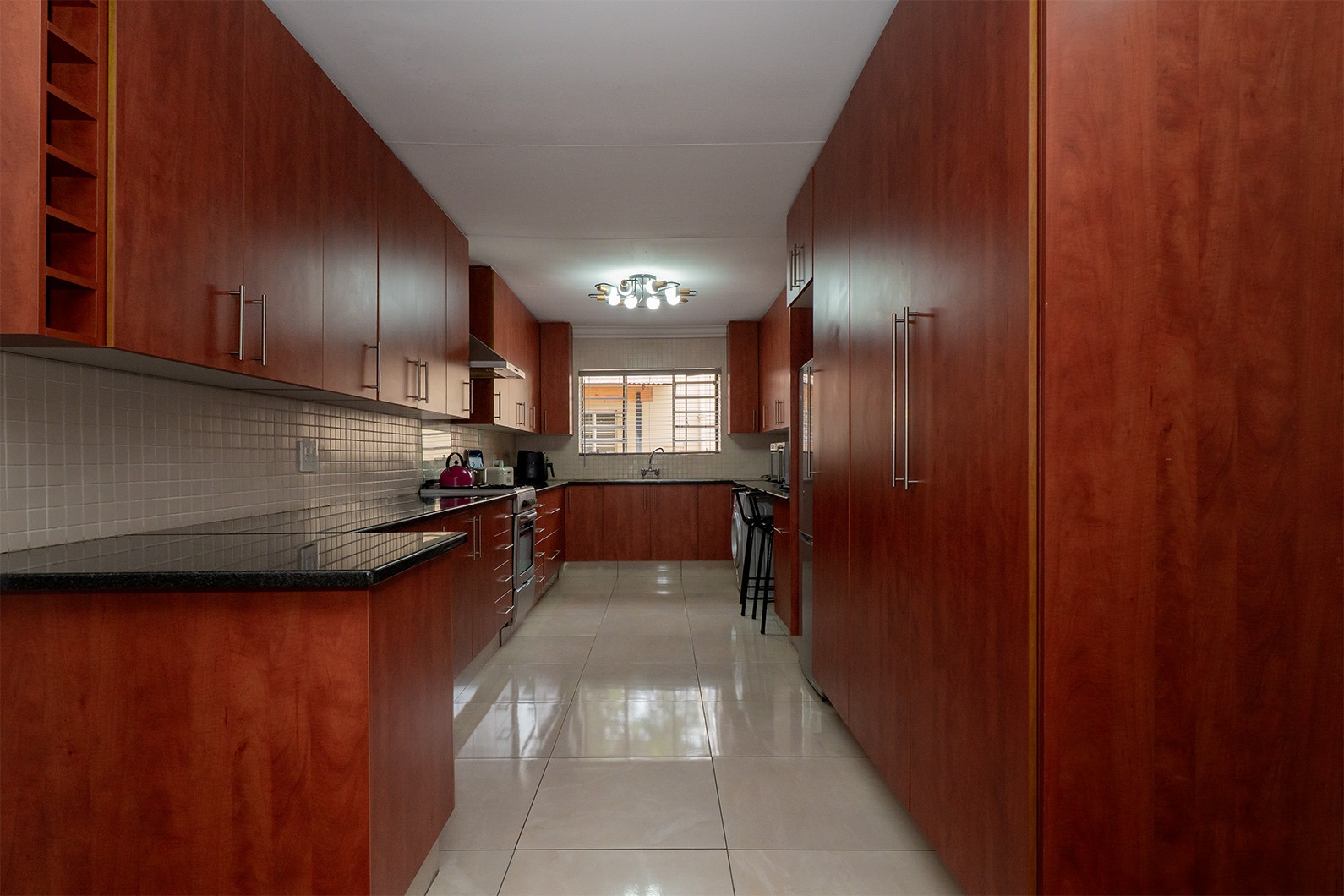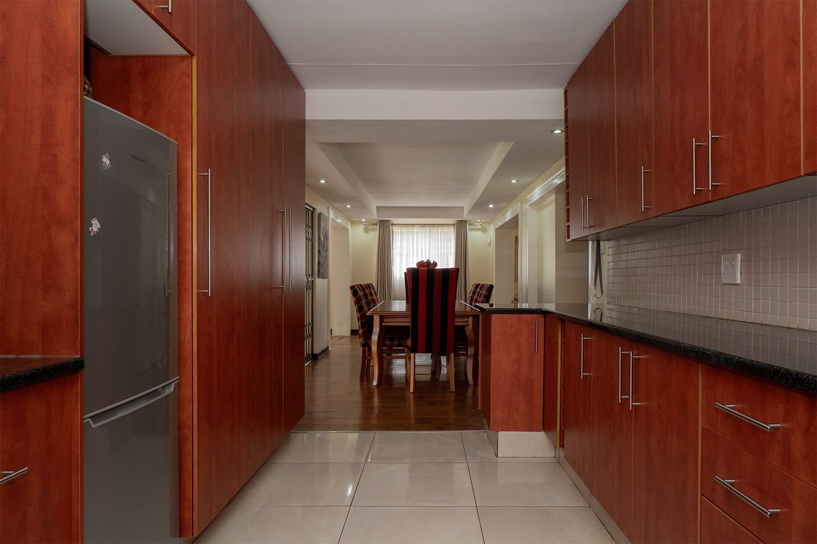 At the heart of the home is the open-plan kitchen and dining area, seamlessly flowing through double sliding doors onto an enclosed patio. This inviting space includes an undercover braai and enjoys tranquil views over the pristine, manicured garden, complete with a variety of established fruit trees.
