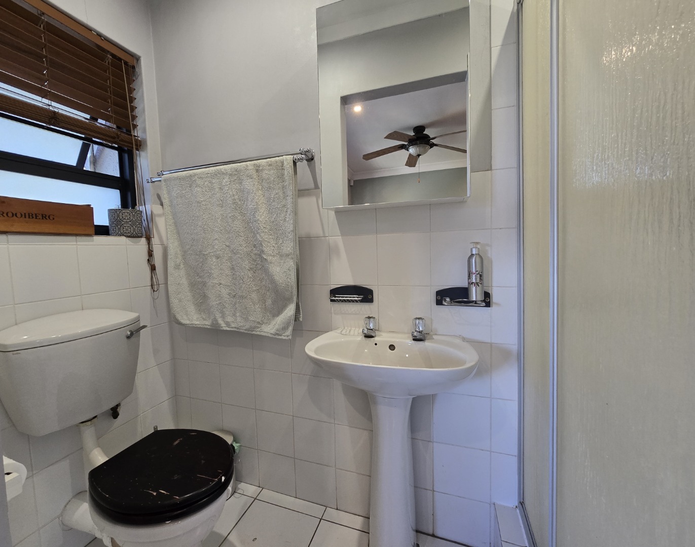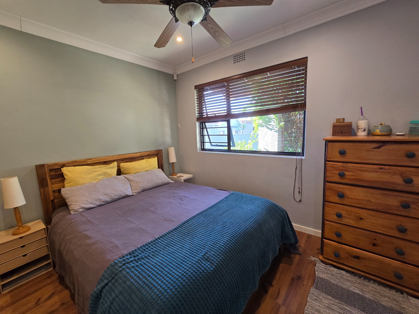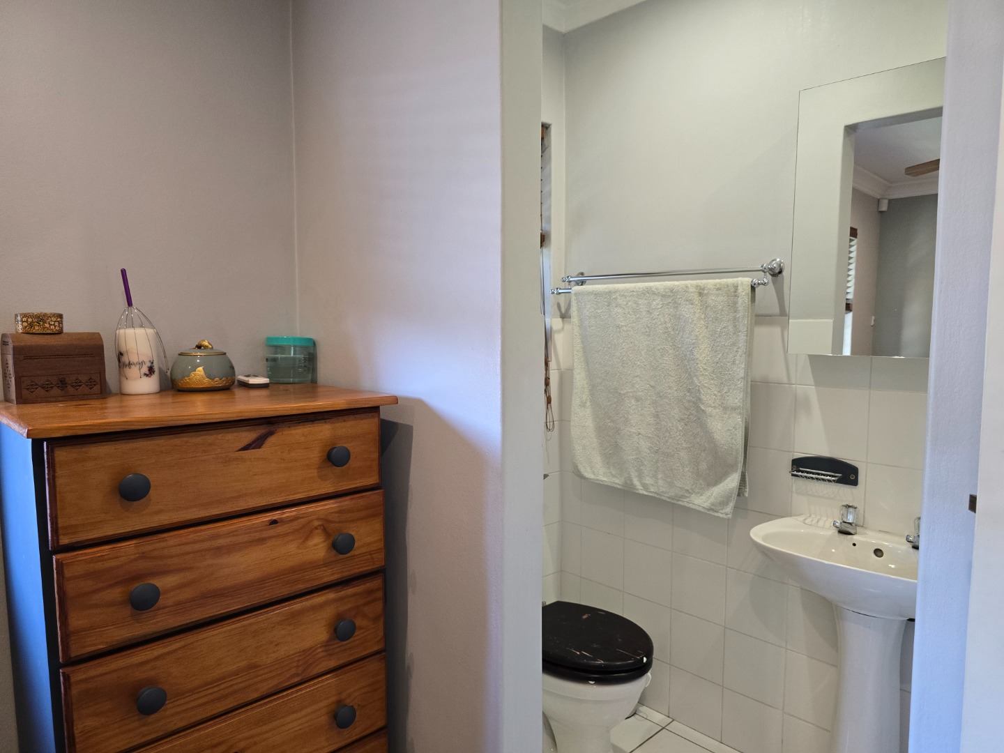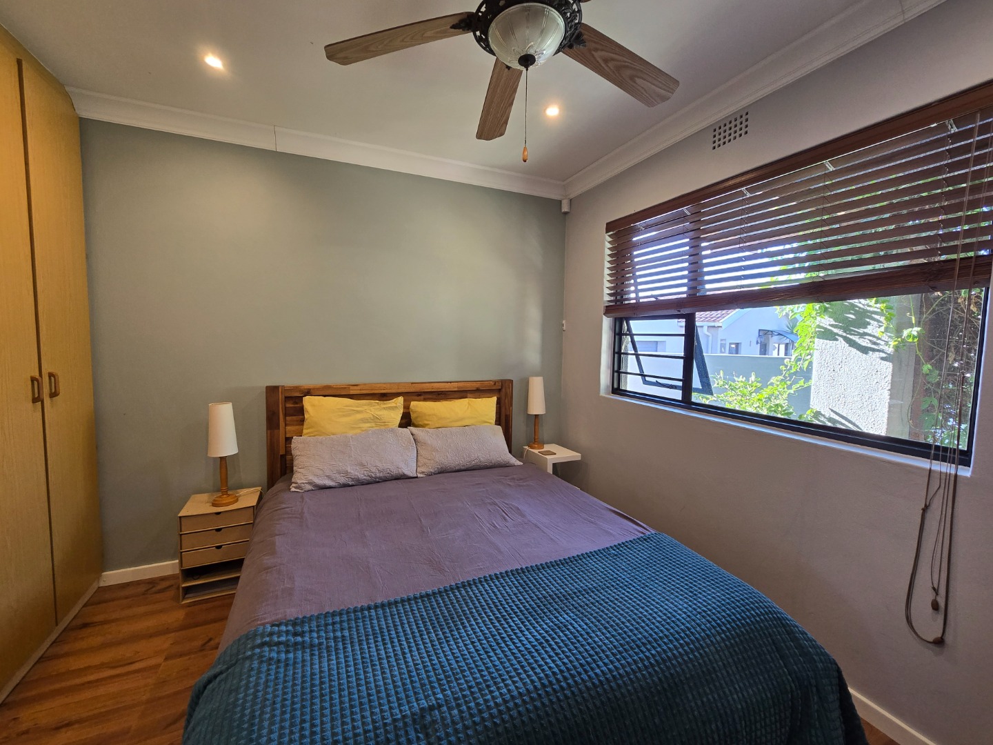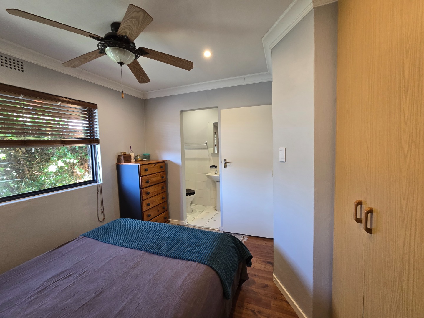 The property features two lovely Bedrooms, both with fitted built-in cupboards and laminated flooring. The main Bedroom boasts added luxury of an en-suit Bathroom, complete with shower, basin and toilet! The second Bedroom is equally inviting, along with built-in shelving, ideal for storing books, décor or personal items, adding a touch of functionality and charm. A beautiful Family Bathroom serves the rest of the home and includes a basin, toilet and a corner bath, that immediately draws the eye!