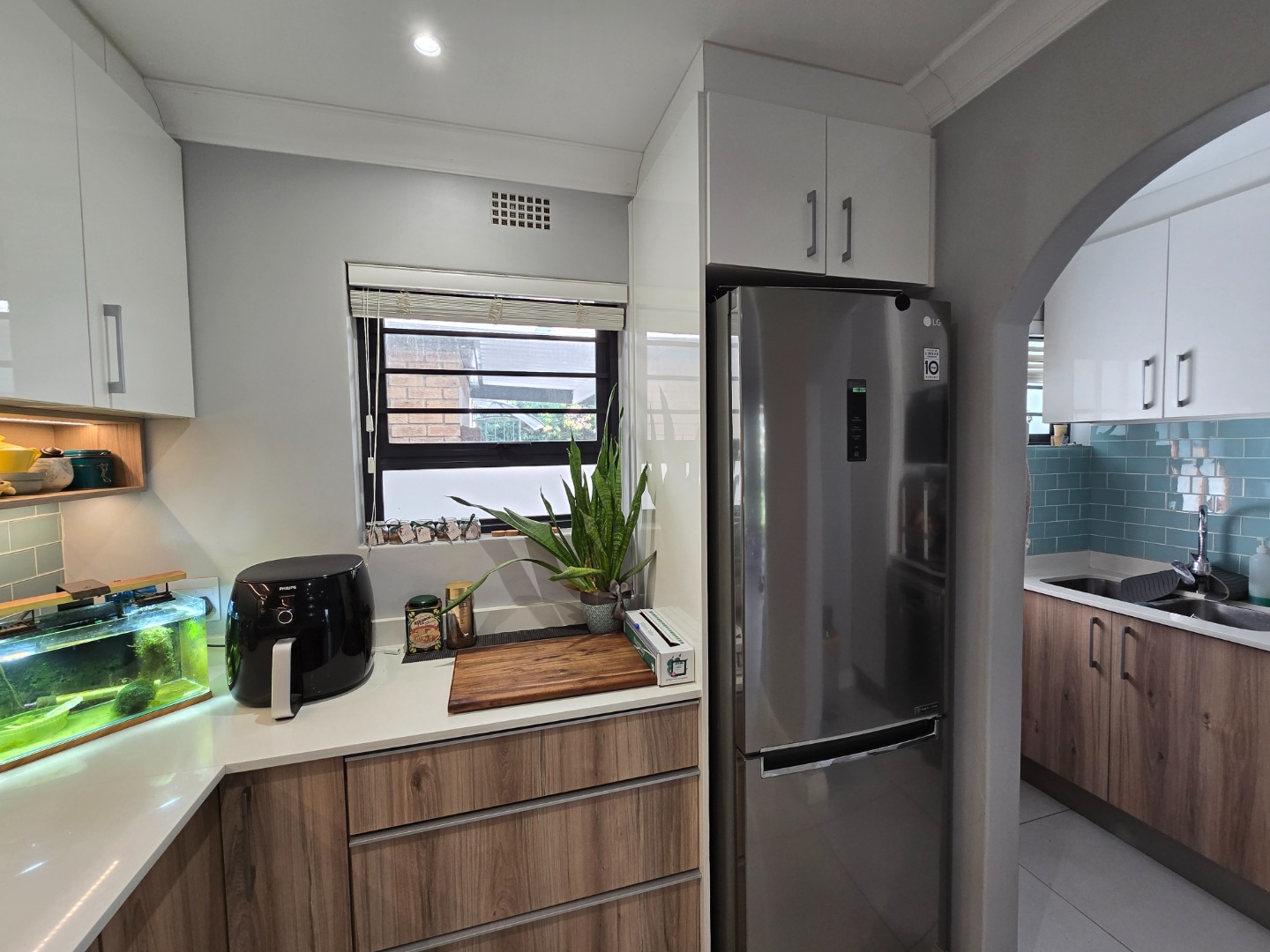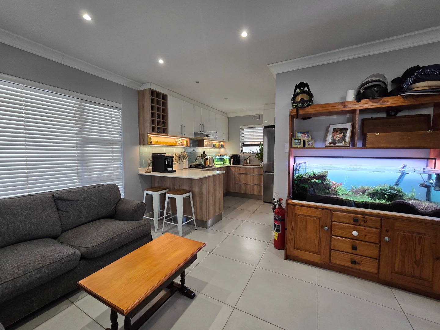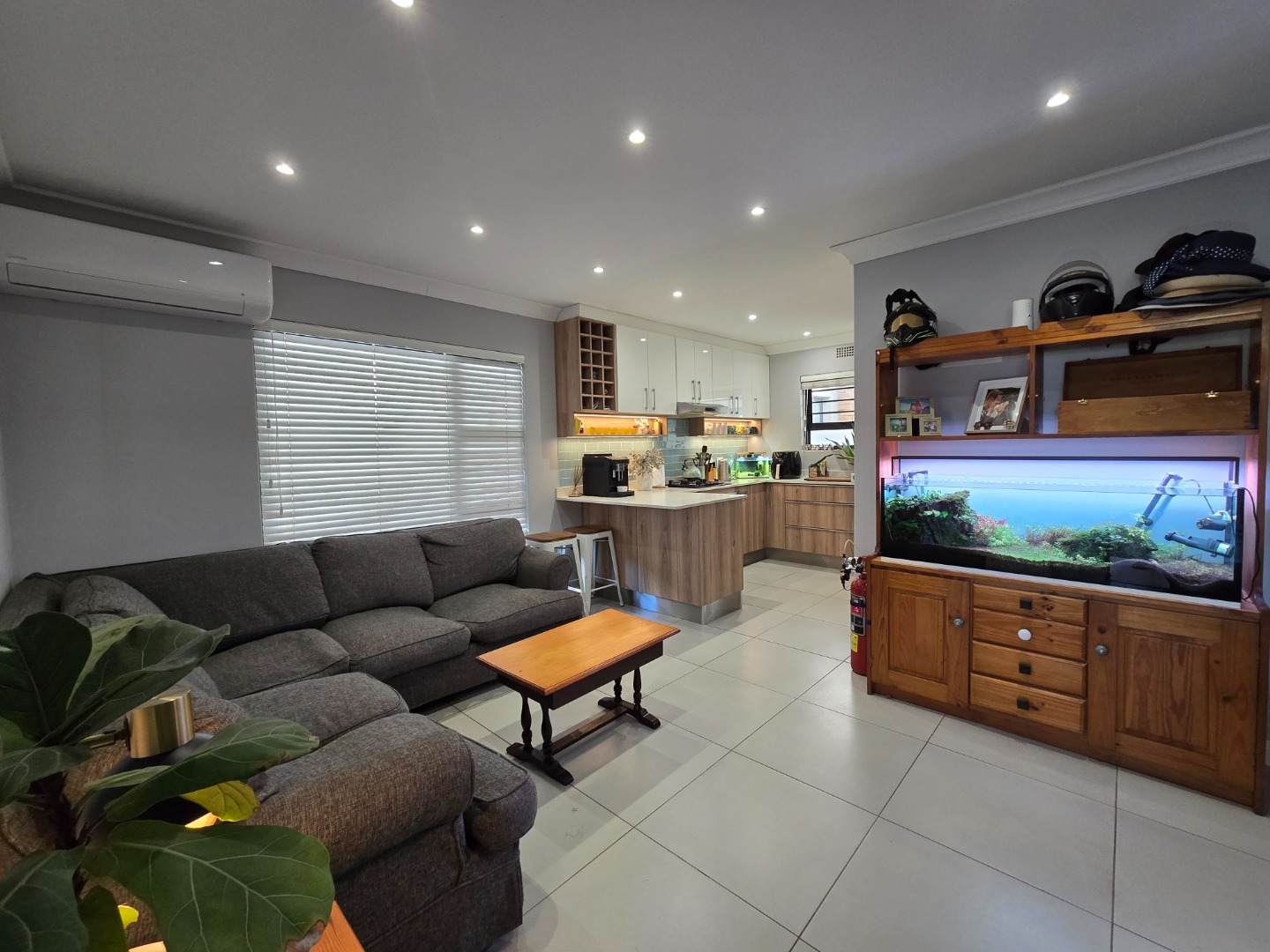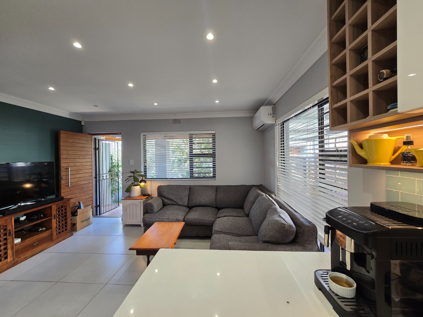 This unique home, offers an OPEN PLAN, beautiful modern and renovated Kitchen. This stylish Kitchen, features a built in gas hob, Ceaser stone worktops and undershelve lighting, that adds to a soft, but warm glow on the worktops and in the Kitchen area... From the Kitchen, a seamless flow into a Living/TV Room, complete with Blinds on both windows and the comfort of an Airconditioner! A separate Laundry/Scullery is conveniently tucked just off the Kitchen, practicality adding to this delightful space! The downlights in the Kitchen and Living area, enhance a calm and and contempary atmosphere....