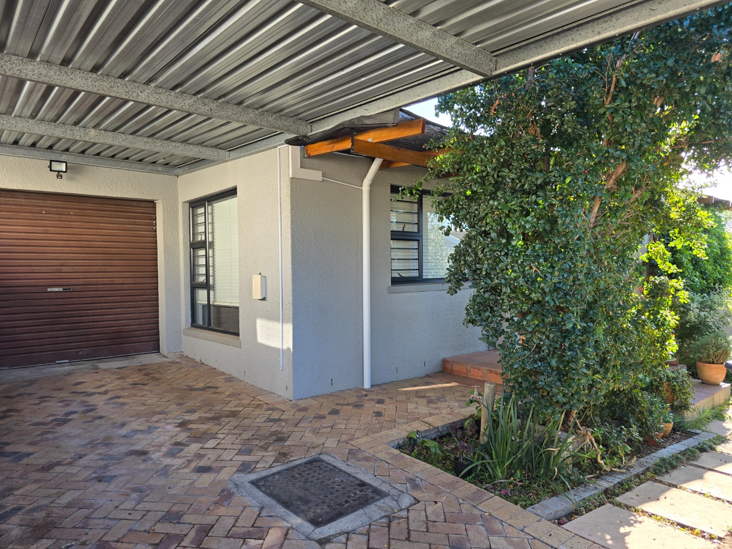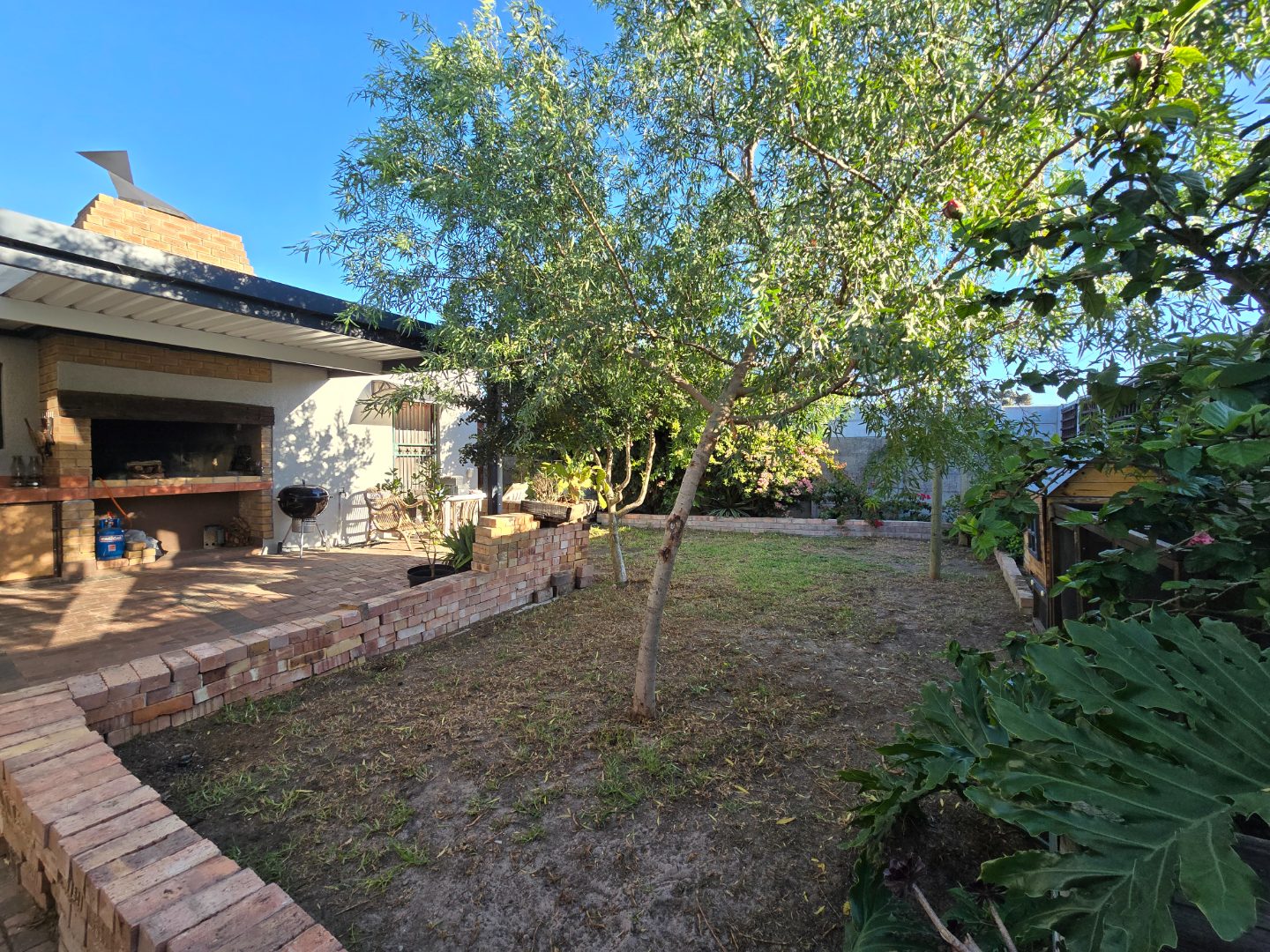 Enjoy entertaining family and friends in the in the under-roof covered built-in braai area, perfect and private for year-round gatherings. The picturesque, garden, flowing off the braai area, is beautifully surrounded with trees, plants and greenery! The kids /dogs will love and have the comfort of enjoying the freedom of a spacious, grass filled garden area! Two doors from the entertainment area, give access into the Garage!