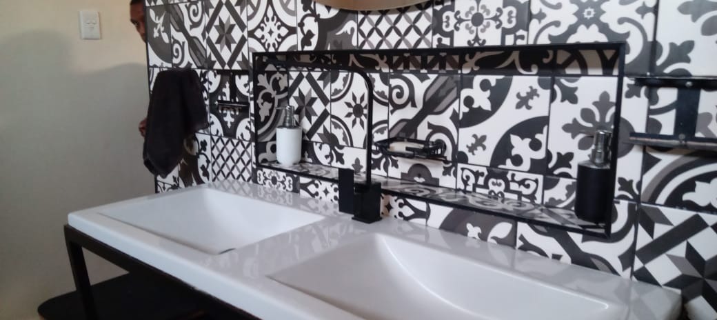 Step inside to an expansive open-plan living environment, seamlessly connecting the lounge, dining area, and kitchen. This versatile space is ideal for both daily family life and entertaining guests. The heart of the home, the kitchen, boasts contemporary grey cabinetry, dark countertops, and a distinctive patterned tiled backsplash. It is well-appointed with quality appliances, including a Bosch oven and gas hob, complemented by a double stainless steel sink and ample natural light.