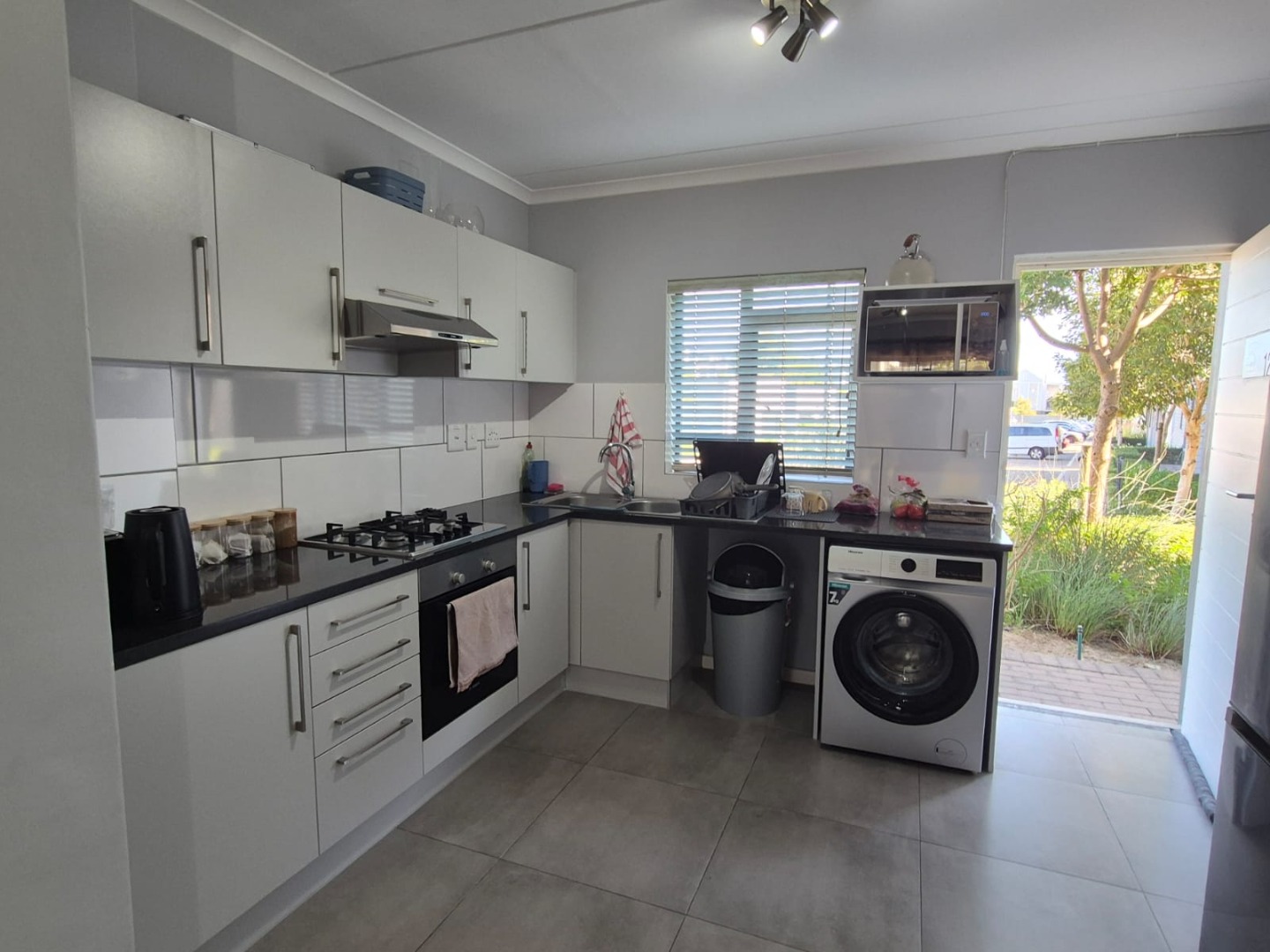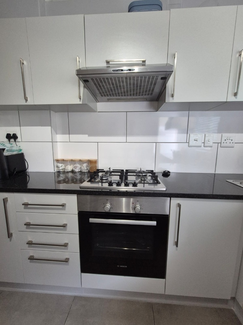- Kitchen, tiled flooring with oven, built-in-cupboards